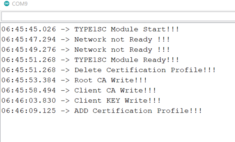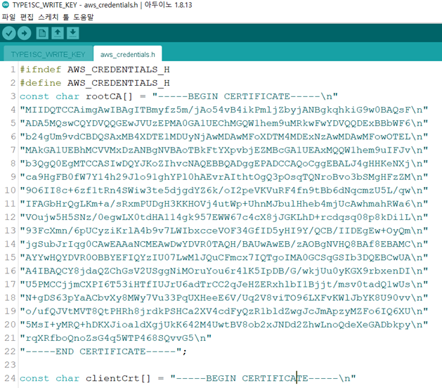 다운로드 받은 인증서를 헤더파일에 넣어서 예제로 세가지 키값을 모뎀에 인스톨
