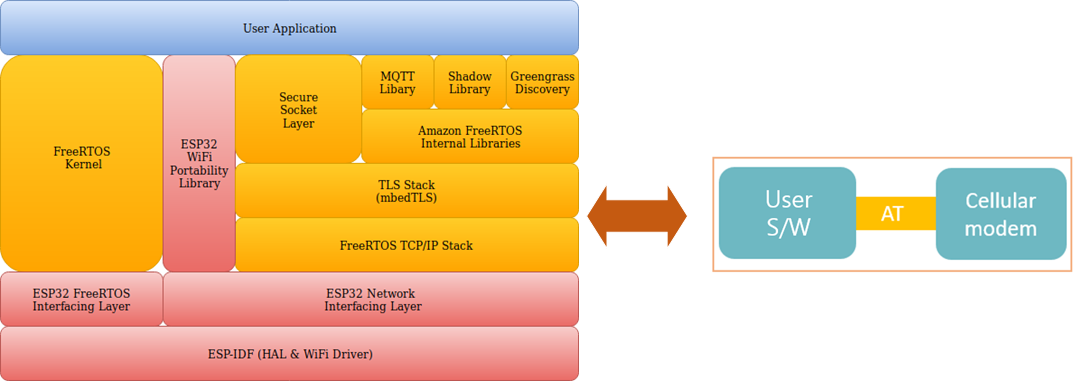 구조비교 (왼쪽은 MCU에서 AWS SDK연동, 오른쪽 CATM1으로 간단히 명령어로 제어)