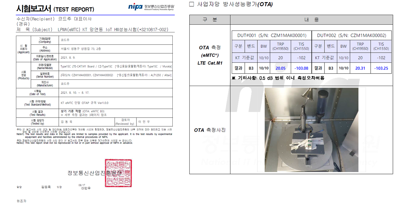 내장형 모뎀 LPWA KT 망연동 시험성적서