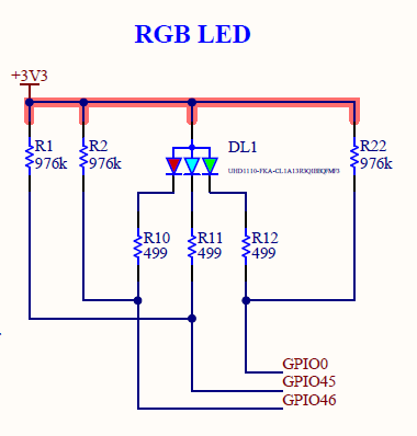 회로를 보면 3.3V 아래로 Red(GPIO46), Blue(GPIO45), Green(GPIO0)이 연결된 것을 확인할 수 있습니다.