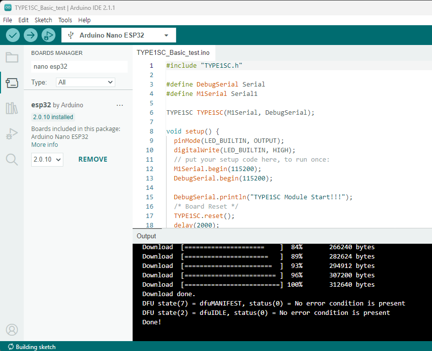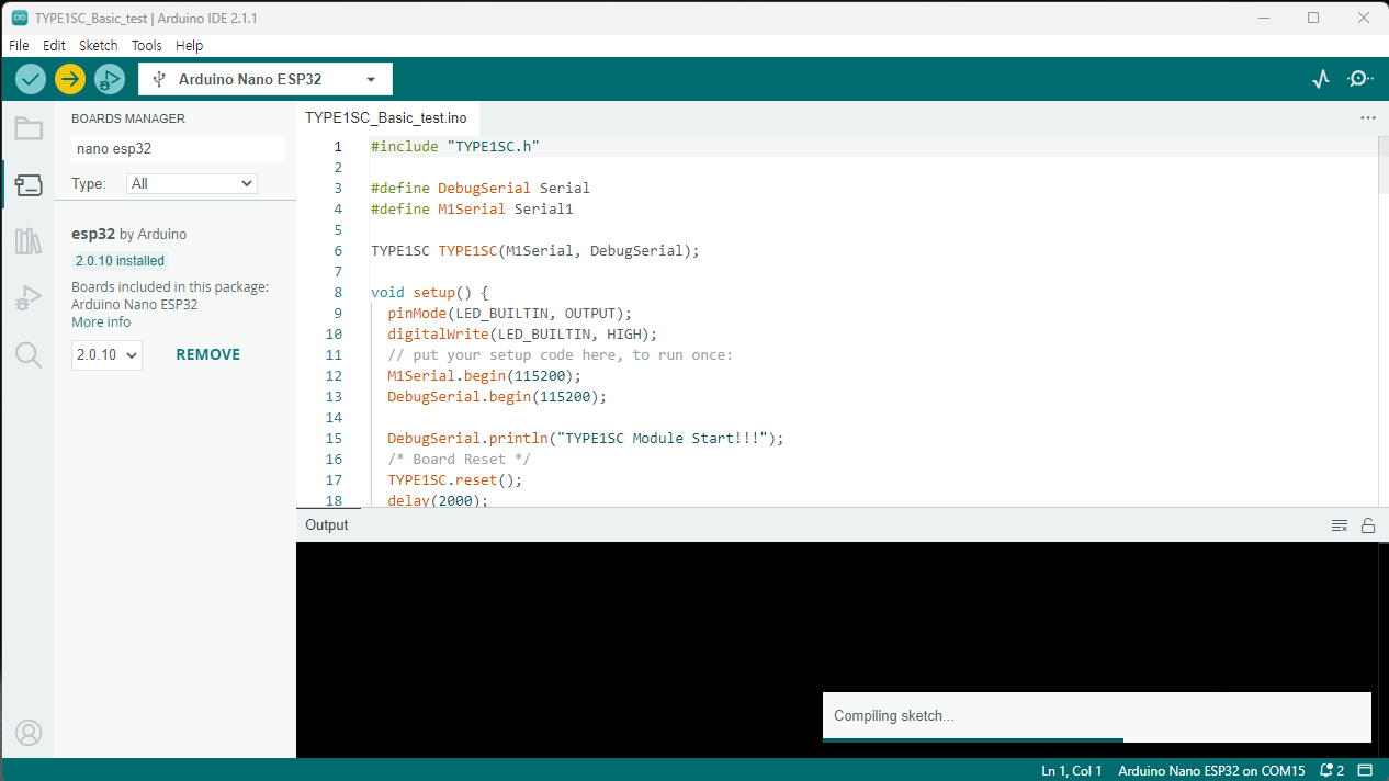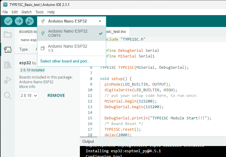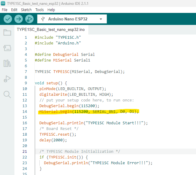 Examples --> TYPE1SC-main --> Arduino_New_Nano --> TYPE1SC_Basic_test 선택 코드를 수정하지 않고 Upload 합니다.