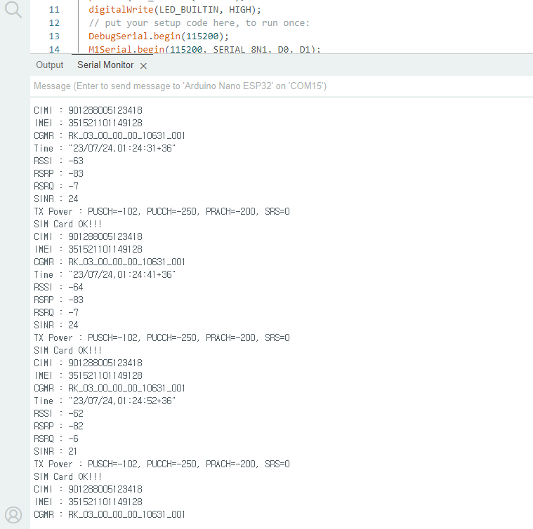 M1Serial.begin(115200, SERIAL_8N1, D0, D1); 수정 후 다시 Upload 하면 아래와 같이 정상 동작하는 것을 확인할 수 있습니다.