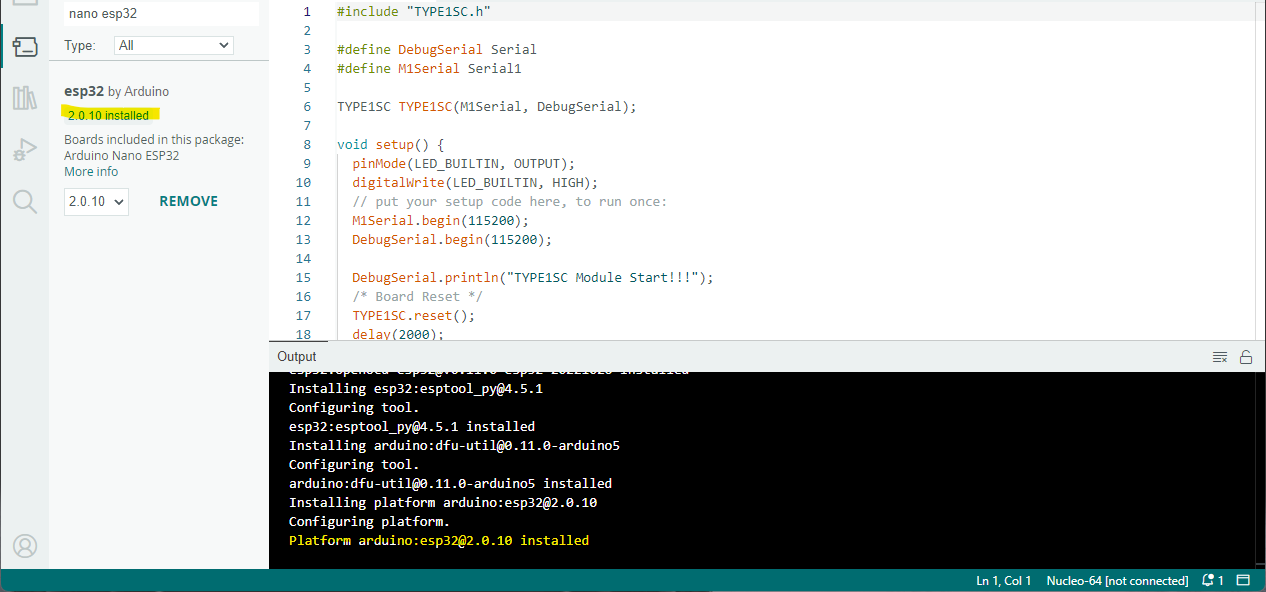 Platform arduino:esp32@2.0.10 installed Arduino NANO ESP32 보드를 PC에 연결 후 보드를 선택합니다.