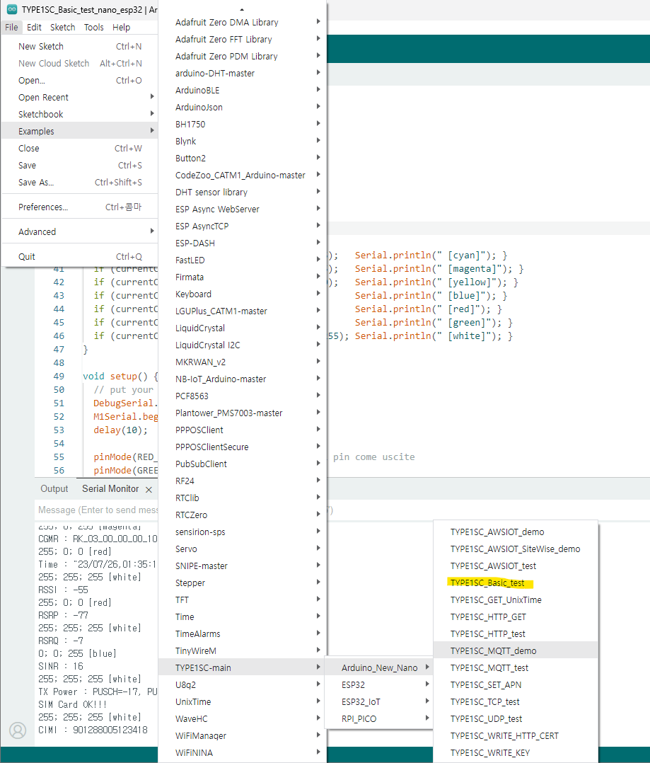 이제 LTE CATM1 내장형 모뎀을 동작시키기 위해 아래와 같이 TYPE1SC_Basic_test 예제를 불러옵니다.