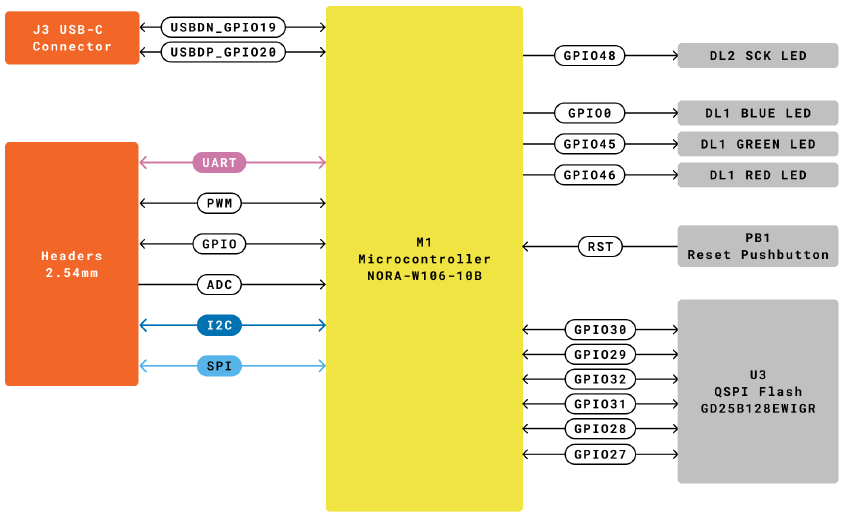 Arduino NANO ESP32 Block Diagram ESP32-S3 코어 기반으로 제작된 Ublox NORA-W106-10B 모듈과 Quad SPI 16MB Flash Memory, USB-C Connector, RGB LED, SCK LED, Power LED, Reset Button으로 구성되어 있습니다.
