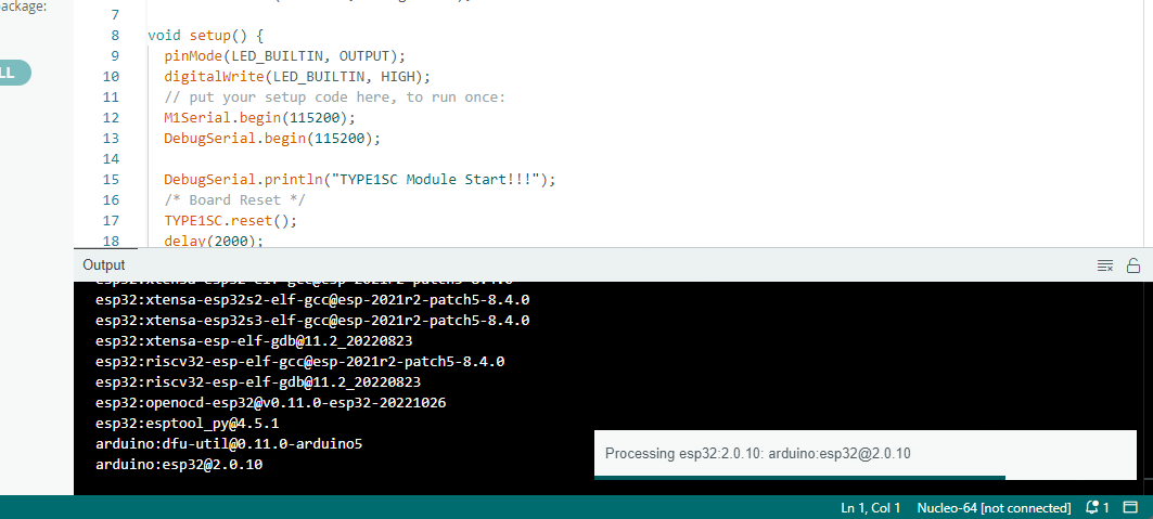 Examples --> TYPE1SC-main --> Arduino_New_Nano --> TYPE1SC_Basic_test 선택 코드를 수정하지 않고 Upload 합니다.
