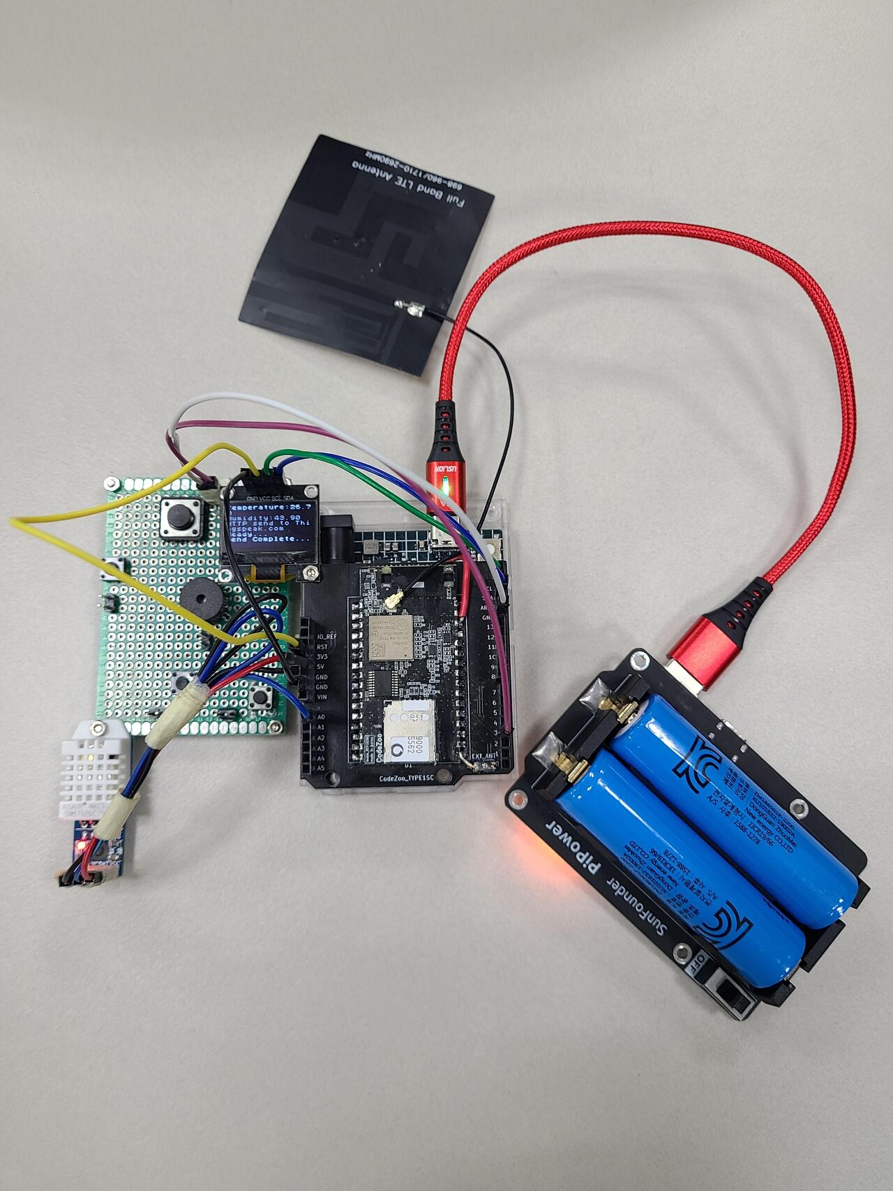 LTE CATM1 내장형 모뎀(+쉴드), 외장 안테나, 0.96인치 OLED 디스플레이, DHT22 온습도 센서, 버튼으로 구성했습니다.