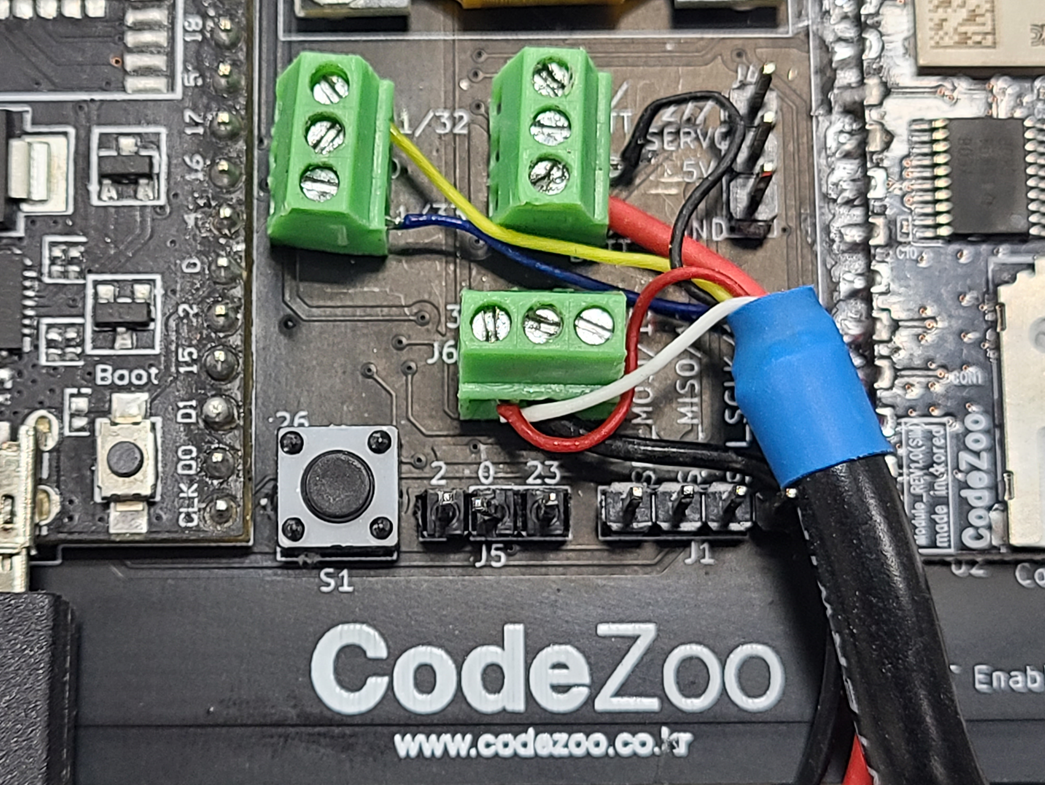 토양센서의 노란색(UART RX) 라인은 31번, 파란색(UART TX) 라인은 33번, 검은색(GND) 라인은 GND, 빨간색(3V3) 라인은 3V3, 흰색(Sensor Enable) 라인은 25번에 연결합니다.
