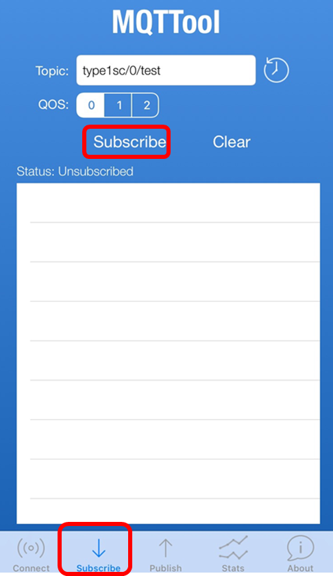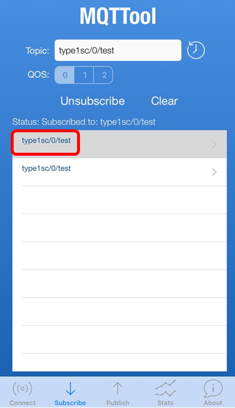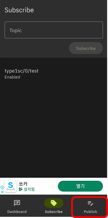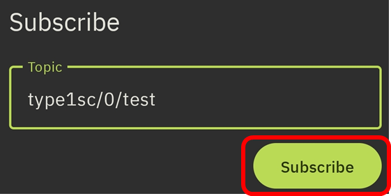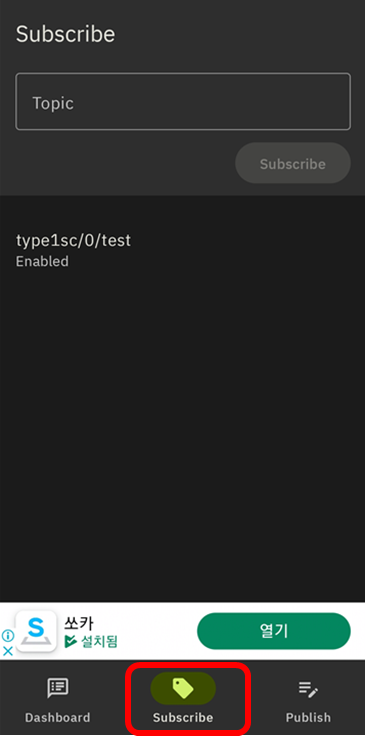 Subscribe탭 Subscribe탭을 선택 후 Topic을 'type1sc/0/test'로 입력합니다. 그리고 Subscribe 버튼을 누릅니다.