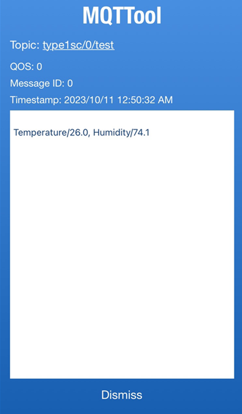 메시지를 클릭하면 아래와 같이 메시지 내용과 타임스탬프, QOS정보 등을 확인할 수 있습니다. Dismiss를 누르면 창이 닫힙니다.