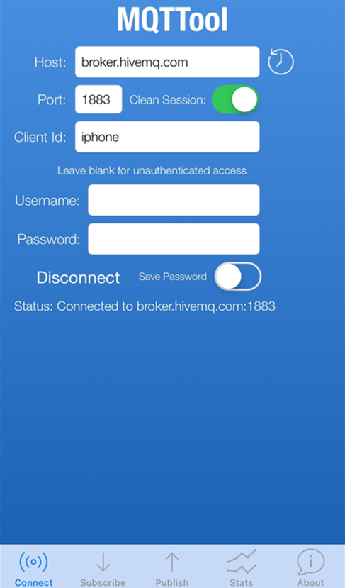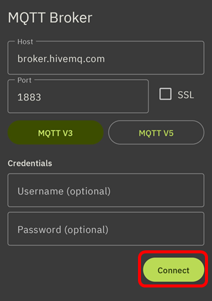 Host, Port 설정 화면 Host는 broker.hivemq.com, Port는 1883으로 설정 후 Connect로 연결합니다.