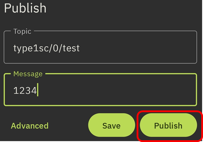 Publish 입력 화면 Publish 입력 화면에서 Topic 'type1sc/0/test'를 입력하고 Message 입력 후 Publish 버튼을 누릅니다.