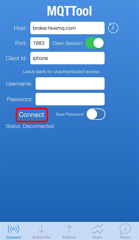 Connect탭 설정 화면 앱을 실행하면 Connect탭에서 시작하는데, Host, Port, Client Id를 입력 후 Connect 버튼을 누릅니다.