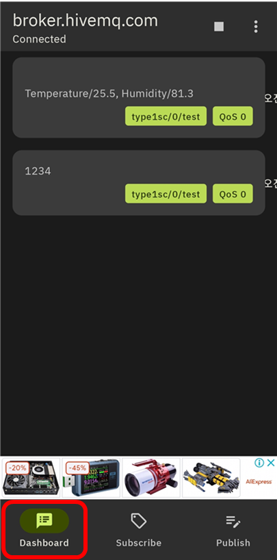 Dashboard탭 Dashboard탭을 선택 후 Publish 한 메시지가 잘 들어왔는지 확인합니다.