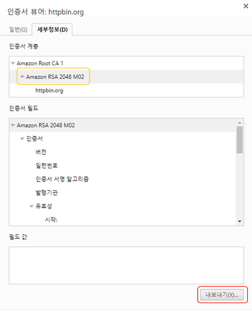 인증서 계층에서 httpbin.org 한 단계 위인 'Amazon RSA 2048 M02'를 클릭하고 아래 내보내기 버튼을 누릅니다.
