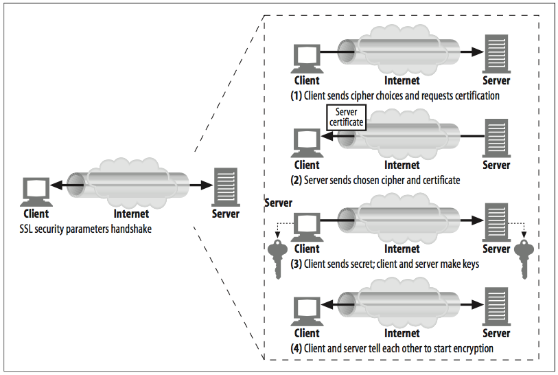 SSL handshake (simplified) ( https://heidyhe.github.io/https ) 1. 브라우저는 웹 서버의 포트 443(HTTPS의 기본포트)에 대한 TCP 연결을 설정합니다.
