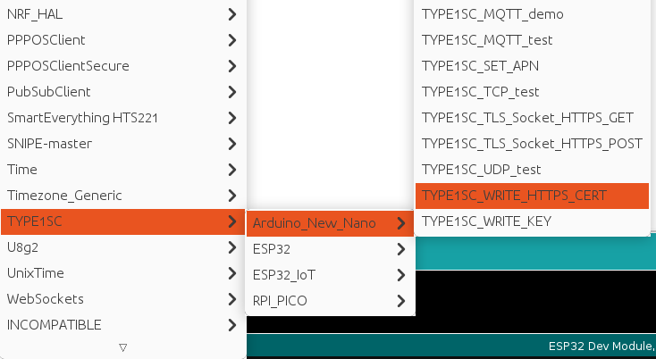 Arduino UNO R4(MINIMA, WIFI), NANO ESP32, NANO 33 IoT, NANO BLE Sense는 Arduino New Nano 아래에 있는 TYPE1SC_WRITE_HTTPS_CERT를 선택하시고 ESP32, RP2040의 경우 각각 아래에 있는 TYPE1SC_WRITE_HTTPS_CERT를 선택하시면 됩니다.