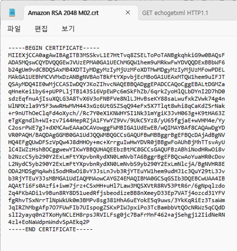이전에 파일로 저장했던 인증서를 가져옵니다. 메모장을 열고 인증서를 불러옵니다.
