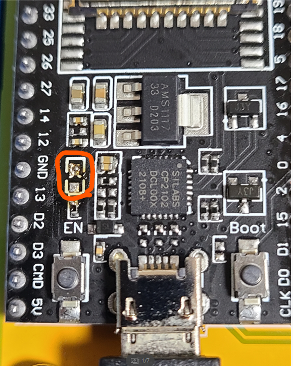 ESP32 보드에 전원 LED가 연결된 보드가 있습니다. 칩LED을 켜두면 20mA~50mA까지 시간당 배터리를 소모시킬 수 있습니다. 처음 설치 후 배터리를 좀 더 절약하기 위해 인두기로 아래와 같이 칩LED를 제거했습니다.
