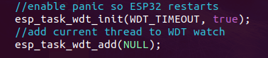 사용하기 위해서는 먼저 'esp_task_wdt_init' API에 타임아웃값을 입력해서 초기화하고 만들어진 타이머를 시스템에 연결합니다.