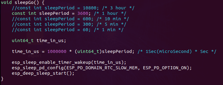 RTC(Real Time Clock)로 깨울 시간을 설정하고 ESP32 IoT 보드를 재웁니다. 깨우는 시간은 초단위로 설정합니다.