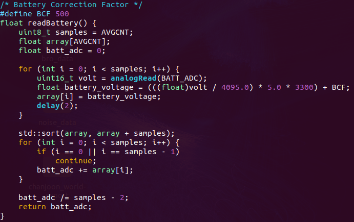 - 배터리 값을 ADC로 샘플링(30회) 후 값을 정렬해서 최대값과 최소값은 버리고 나머지 값들을 더해 평균값 만듭니다.