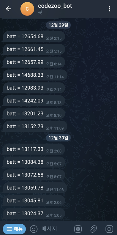 이제 사용하는 텔레그램 메신저로 자동차의 배터리 값을 원하는 시간주기로 받으실 수 있습니다.