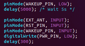 5초 대기 후 EXT_ANT(외부안테나 제어), RST_PIN(모뎀 리셋), WAKEUP_PIN 설정을 INPUT으로 변경합니다.