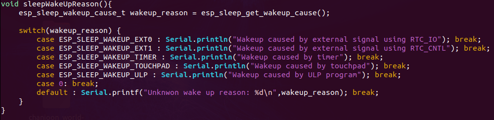 'esp_sleep_get_wakeup_cause' API를 사용해서 시스템이 깨어난 이유를 추적합니다. deep sleep + wakeup 이슈가 있을 때 디버깅 용도로 넣었습니다. 정상적인 경우라면 Wakeup caused by timer 가 출력됩니다. (RTC Wakeup 사용)