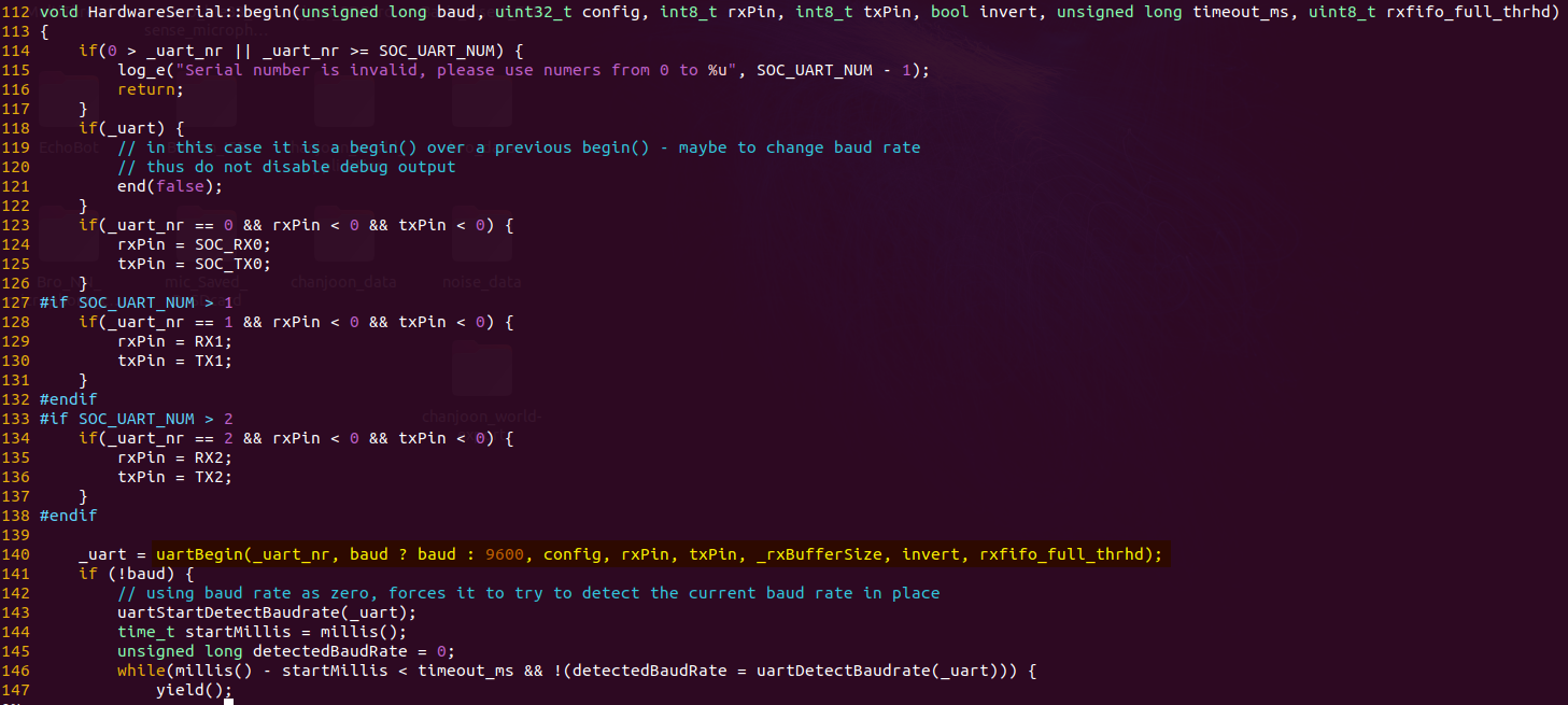 다른 예제들의 경우 일반적으로 Serial1로 선언해서 사용하는데 위와 같이 선언해서 사용한 이유는 다음과 같습니다. .arduino15/packages/esp32/hardware/esp32/2.0.0(버전)/cores/esp32/HardwareSerial.cpp에 사전 정의된 내용을 살펴보겠습니다.