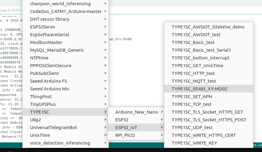 RS485와 Modbus RTU를 이용해서 XY-MD02를 동작시키는 예제는 TYPE1SC 최신 라이브러리를 설치하시면 아래와 같이 선택하실 수 있습니다. TYPE1SC_RS485_XY-MD02 예제를 선택합니다.
