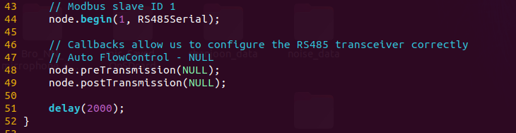 https://github.com/TronixLab/ModBus-RTU-Temperature-Humidity-SHT20-Sensor/tree/main/Examples/1-HardwareSerial_Temperature_and_Humidity__SHT20__Sensor단, 프로젝트에 RS485 컨버터가 auto flow control을 지원하므로 아래와 같이 preTransmission와 postTransmission에 대한 GPIO제어 구현을 삭제하고 연결 함수포인터를 NULL로 처리해서 흐름제어 동작을 하지 않도록 설정했습니다.