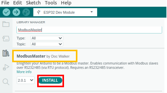 ModbusMaster를 입력하고 최신 라이브러리(2.0.1)를 설치합니다.
