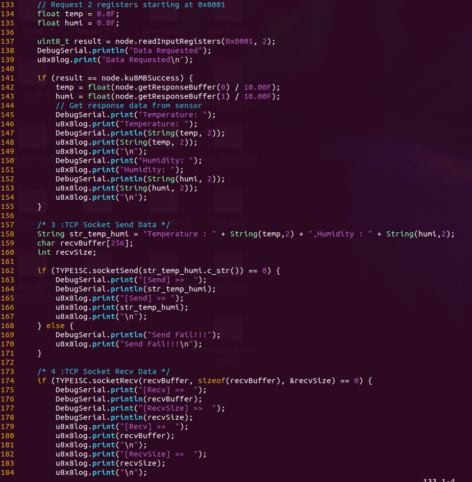 기존 TCP소켓 테스트 코드에서 아래 부분이 추가되었습니다. 소켓이 연결되면 온습도 센서의 레지스터를 읽어서 온습도 값을 얻어온 후 String 변수에 담아서 character 배열로 변경 후 전송하고 서버에서 동일한 결과 값을 받아오는지 확인하는 코드입니다.