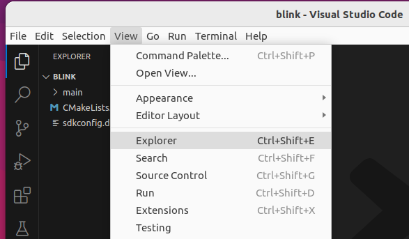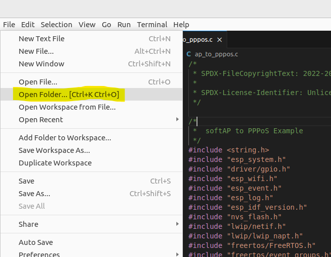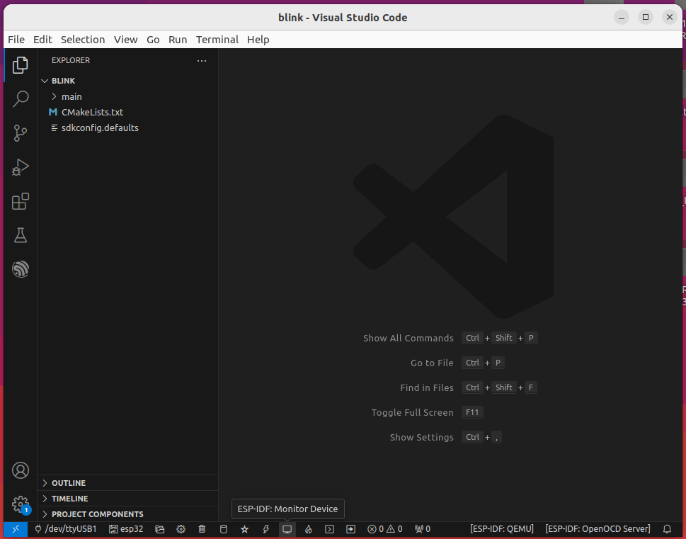 Visual Studio Code를 실행하고 File → Open Folder를 실행합니다. ESP-IDF 개발환경이 준비되어 있지 않으면 링크 내용을 참고해서 설치합니다. https://codezoo.tistory.com/79