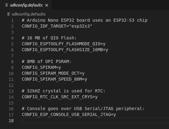 Target은 esp32s3이고, Flash Memory는 Quad SPI 인터페이스의 16MB, Octa SPI 인터페이스 PSRAM 8MB를 지원합니다. 외부 32kHz의 RTC 클럭을 지원하고 USB Serial JTAG를 사용합니다. 위 내용은 sdk가 구성될 때 적용되는 옵션이고 이후 Nano ESp32 보드와 ESP-IDF로 다른 프로젝트를 빌드할 때도 default 옵션으로 적용해야 하는 내용입니다.