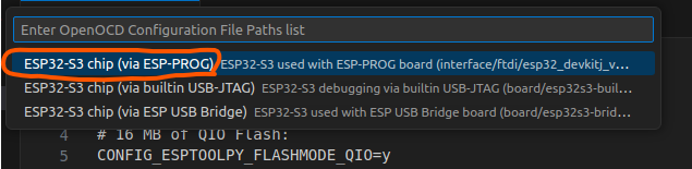 3) OpenOCD 설정 파일 경로를 설정합니다. ESP-PROG를 선택합니다.
