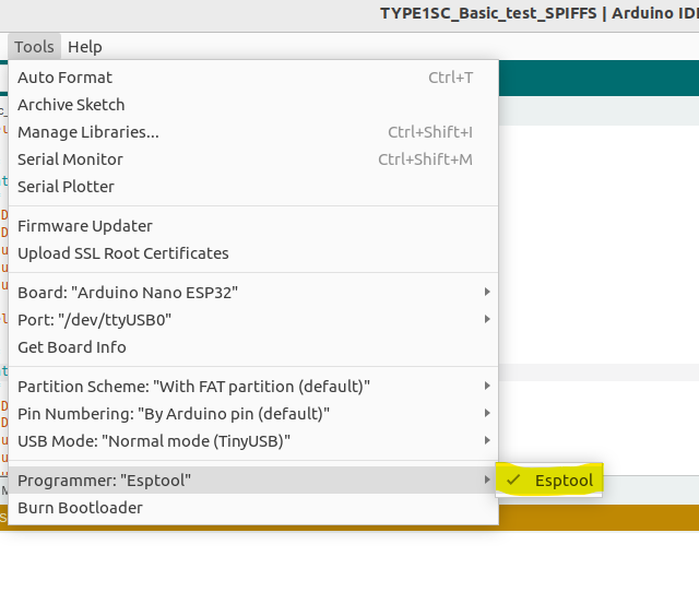 2. Tools → Programmer → Esptool을 선택합니다.