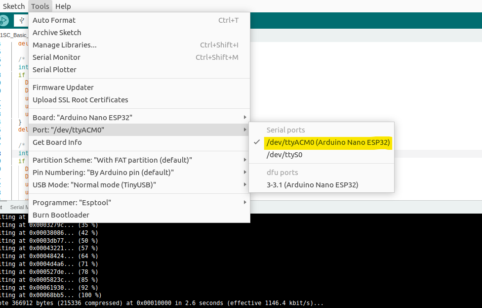 6. Tools → Port를 확인하면 아래와 같이 /dev/USB포트(Arduino Nano ESP32)로 연결된 것을 확인할 수 있습니다.