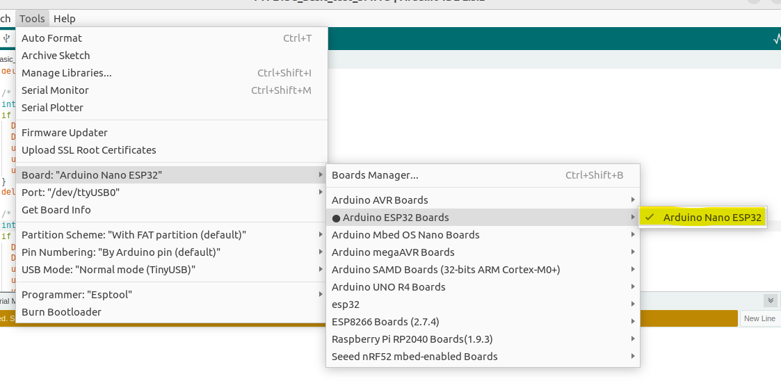 1. Arduino IDE를 실행하고 Tools → Board → Arduino ESP32 Boards → Arduino Nano ESP32를 선택합니다.