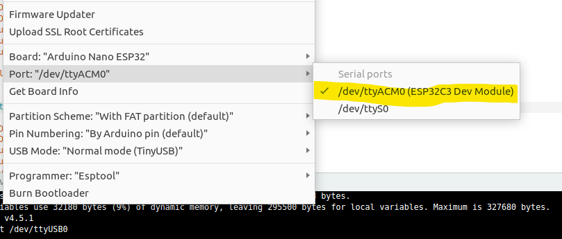 6. Tools → Port를 확인하면 아래와 같이 /dev/USB포트(Arduino Nano ESP32)로 연결된 것을 확인할 수 있습니다.