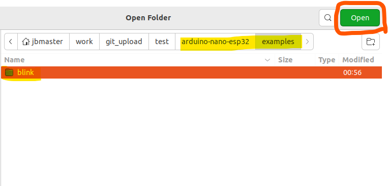 프로젝트를 클론 한 위치로 이동해서 examples → blink를 선택하고 Open 합니다.