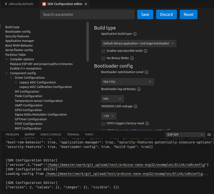Target은 esp32s3이고, Flash Memory는 Quad SPI 인터페이스의 16MB, Octa SPI 인터페이스 PSRAM 8MB를 지원합니다. 외부 32kHz의 RTC 클럭을 지원하고 USB Serial JTAG를 사용합니다. 위 내용은 sdk가 구성될 때 적용되는 옵션이고 이후 Nano ESp32 보드와 ESP-IDF로 다른 프로젝트를 빌드할 때도 default 옵션으로 적용해야 하는 내용입니다.