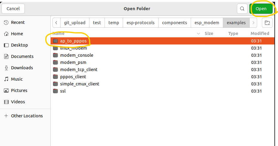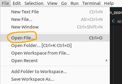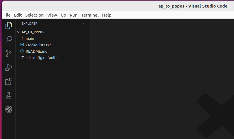 Visual Studio Code를 실행 후 File → Open Folder 실행해서 AP to pppos 예제를 선택합니다.