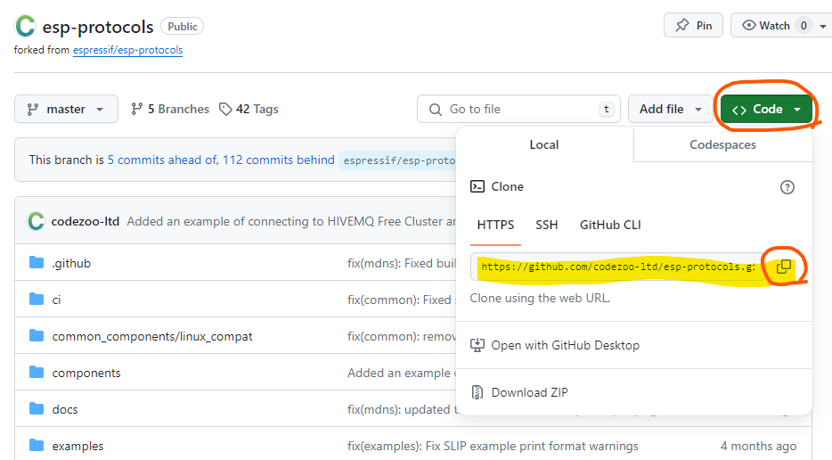 우측 상단 Code 버튼을 누르고 노란색으로 마킹한 부분의 주소를 복사버튼을 눌러서 가져옵니다.
