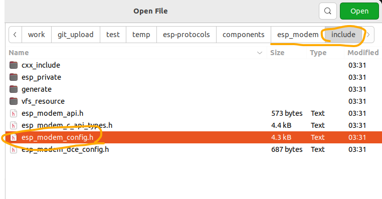 2. 모뎀 UART 설정파일 수정 ( esp_modem_config.h )