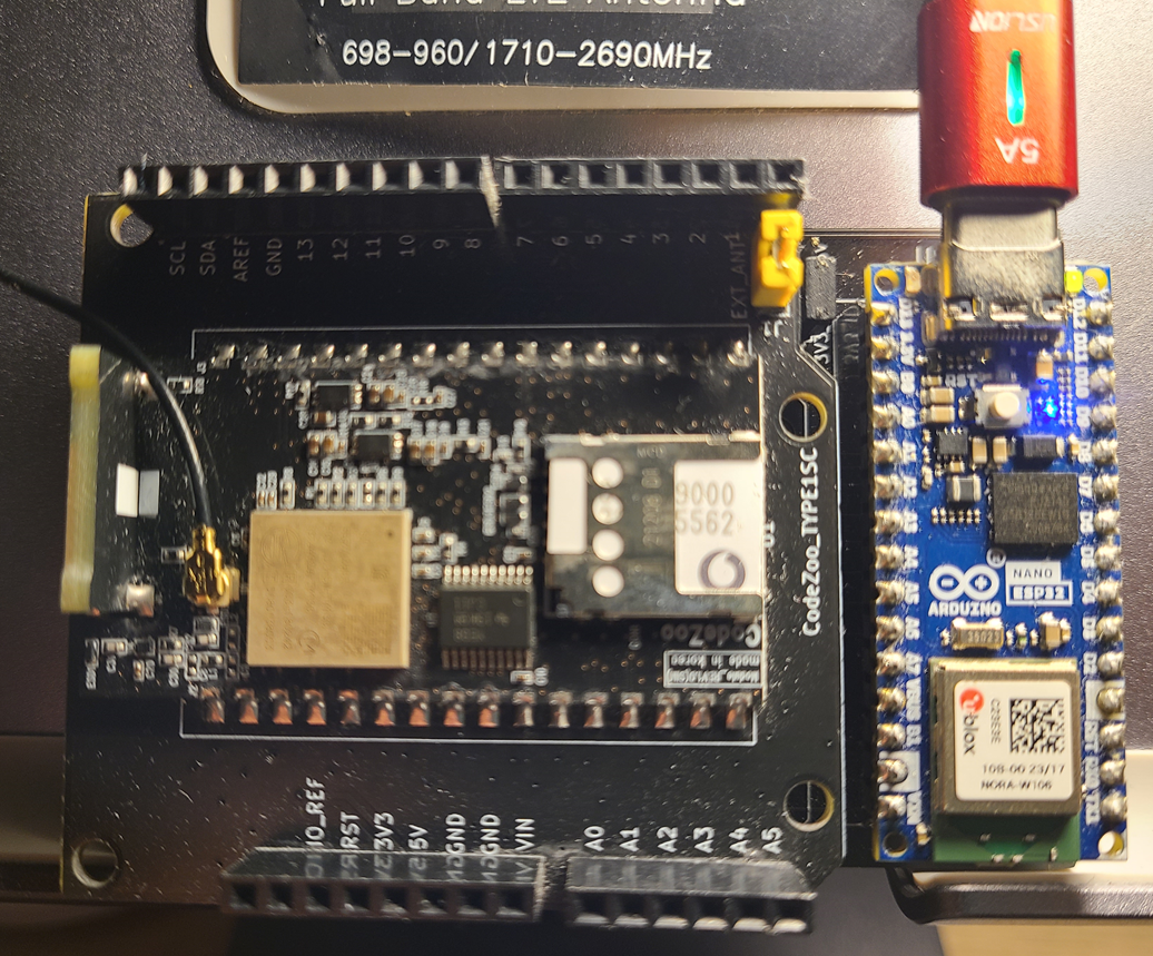먼저 Nano ESP32 보드와 LTE CATM1 모뎀은 아래와 같이 Nano to UNO 확장보드와 아두이노 실드를 이용해서 연결되어 있습니다.