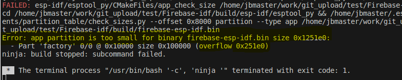 저장 후 다시 빌드합니다. 다시 에러가 발생합니다. 애플리케이션이 올라가는 파티션 사이즈를 초과했다는 메시지입니다.