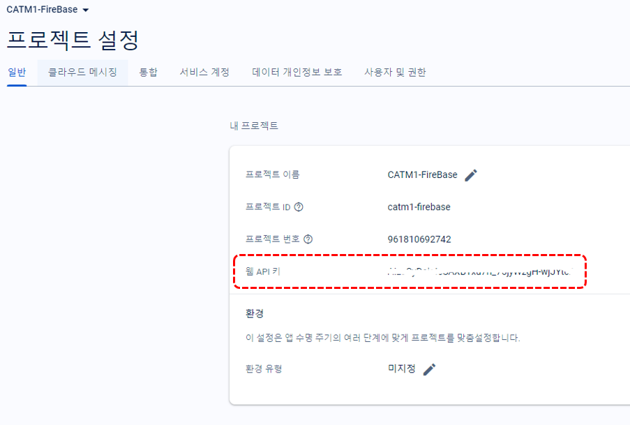 프로젝트 설정 → 일반에서 웹 API 키를 확인합니다.