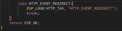 switch~case문에 HTTP_EVENT_REDIRECT가 빠졌다는 내용이므로 해당 부분에 아래와 같이 추가했습니다.